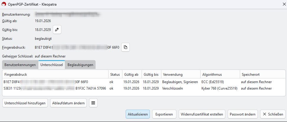 Die aktuelle Version von GnuPG 2.5.16 unterstützt für die Verschlüsselung das hybride Keywrapping mit ML-KEM und elliptischen Kurven. Dabei werden Brainpool P256r1 und P384r1 sowie X25519 und X448 unterstützt. Kleopatra unterstützt bei der Schlüsselerzeugung in der aktuellen Version (aus GPG4win 5.0.0) nur die beiden Brainpool Varianten (ky786_bp256 und ky1024_bp384).
